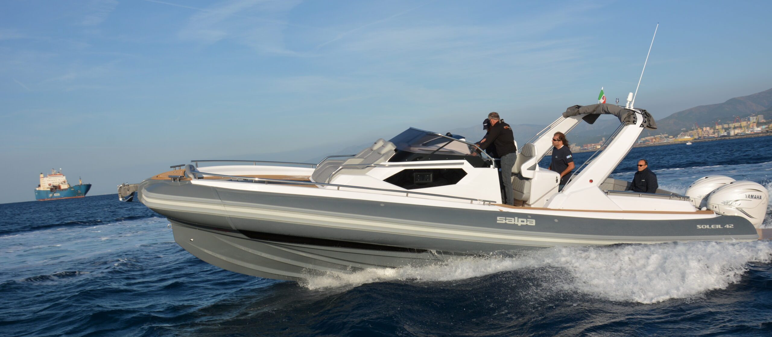 La SOLEIL 42 innova y establece nuevos estándares en la el segmento de las embarcaciones de gran turismo. Esto es gracias al casco creado en colaboración con el especialista inglés Adam Younger , un diseñador de renombre internacional conocido por sus cascos de carreras, que diseñó un casco de rendimiento de doble paso con recta vertical en la proa.